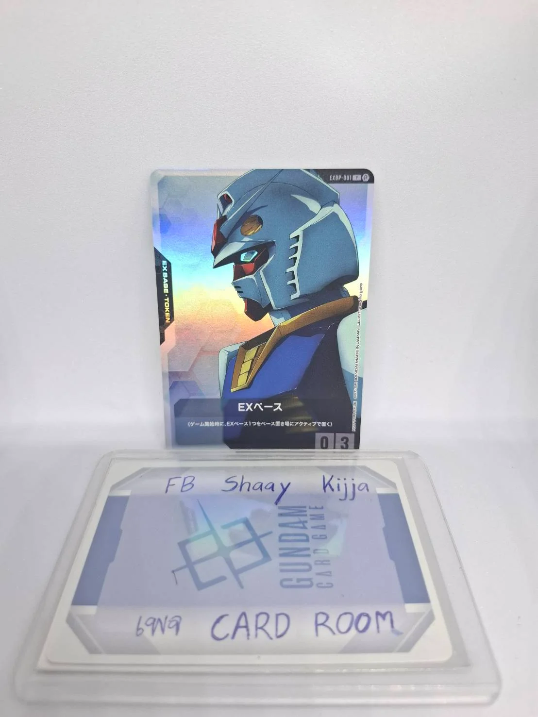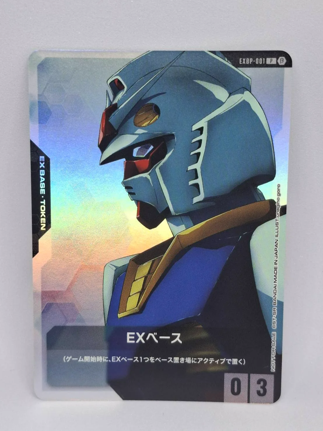 Promo Card EXBP-001 P ตัวอักษร "P" ย่อมาจาก "Promotional Card" (การ์ดส่งเสริมการขาย/การ์ดโปรโม) การ์ด EXBP-001 P (ภาพหัวกันดั้ม RX-78-2) นี้เป็นหนึ่งใน EX Base โทเคนที่หายากและเป็นที่ต้องการ โดยเฉพาะอย่างยิ่งรุ่นที่มีรหัส EXBP-001 P มักถูกแจกจ่ายในช่วงกิจกรรมพิเศษหรือชุดสินค้าลิมิเต็ด โดยเฉพาะการ์ด EXBP-001 P นั้นมีข้อมูลระบุว่า เป็นการ์ดโปรโมที่ได้มาจากกิจกรรม เช่น: "Gundam Card Game Limited Box Ver. Beta Trial Event" (กิจกรรมทดลองเล่นเวอร์ชั่นเบต้า)